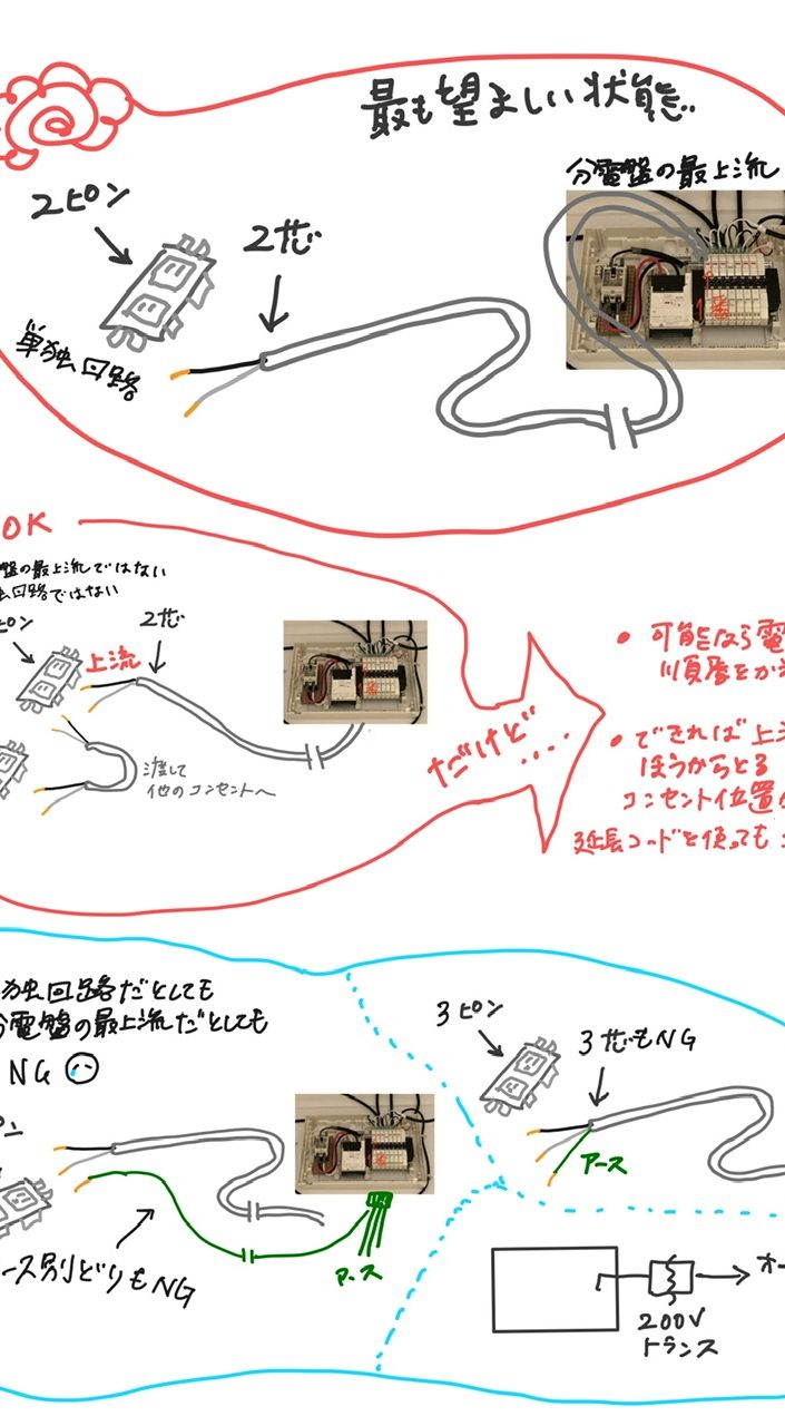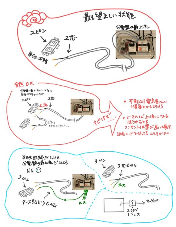 結局、何とかとりなしてもらい、オーディオ用ではなかった、近くの2ピンのコンセントを分電盤の最上流に付け替えてもらったりして事なきを得ているのですが、現場によって伝わり方が異なるため、しつこくしつこくお願いして、途中現場も見に行って・・