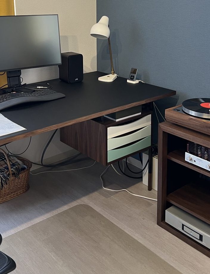 見た目にも、LP12のプリンスとラック、デスクのウォルナットに統一感が出てお客様もお喜びに。特に、LINN LP12 AKITOのトーンアームのブラックがスタイリッシュに際立っています。