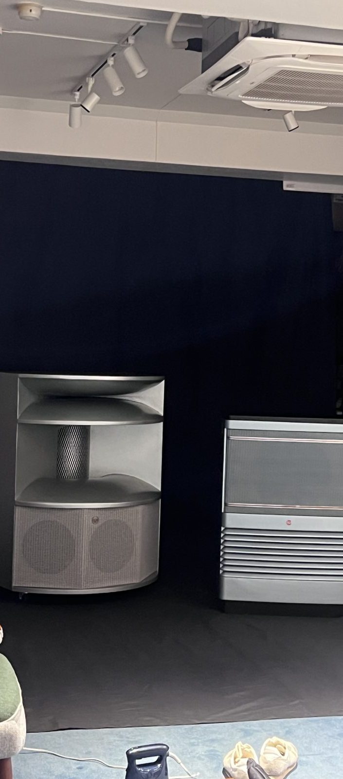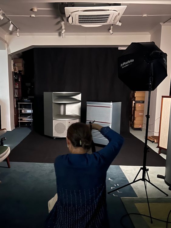 広告用に暗幕を垂らしての撮影はいつもと違った様相。RCA LC-9とLC-1は、照明が当たるととてもスペイシーな印象に。遠い存在だった宇宙に人類がグッと近づいた時代。オーディオもモノラルからステレオに変遷して、どんどん元気になっていく時代ですね。