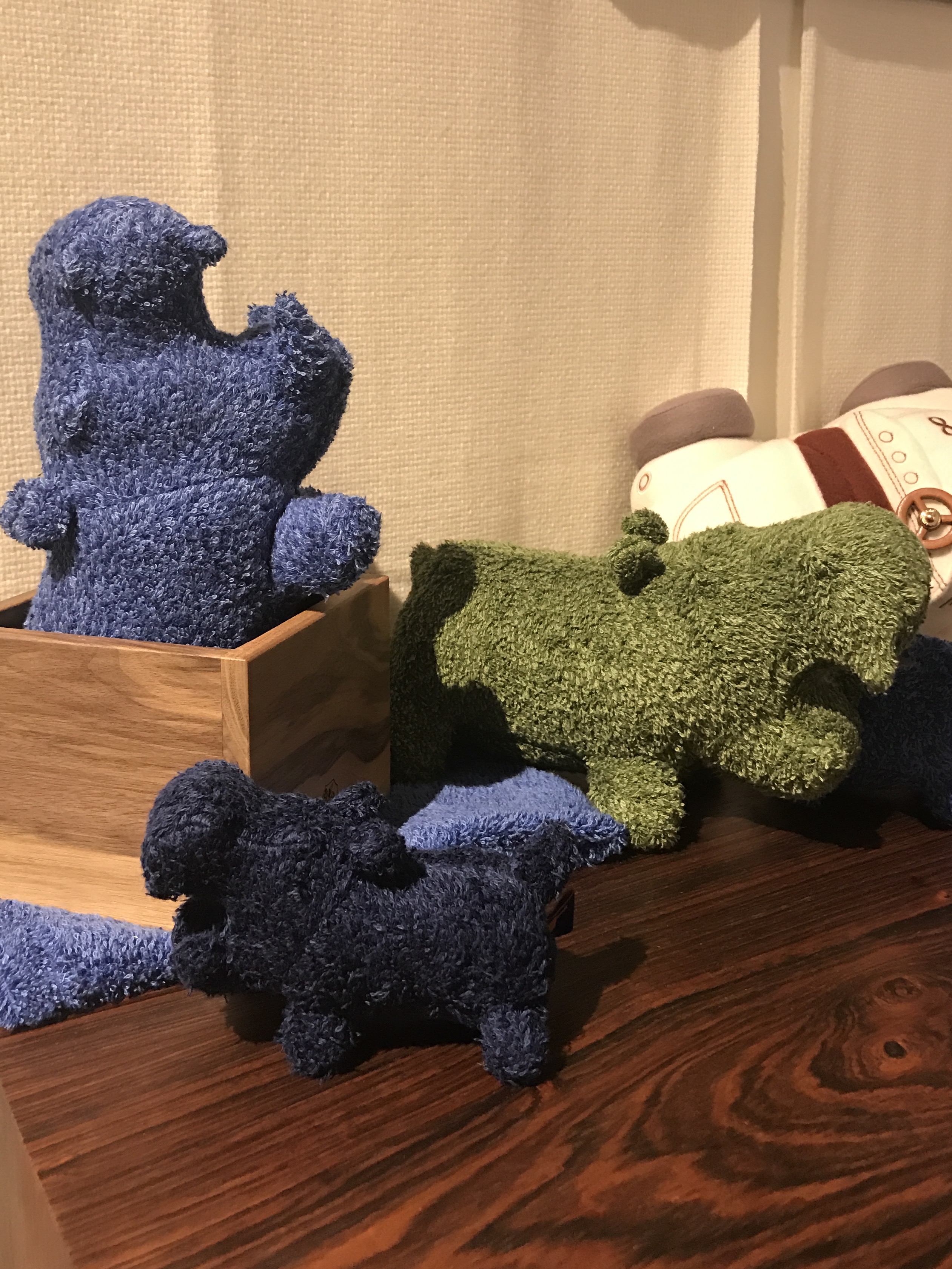 このカバくんたち、タオル地で出来ていて、大きいの小さいのがあります。(銀座三越のリビングフロアなどで購入できます)