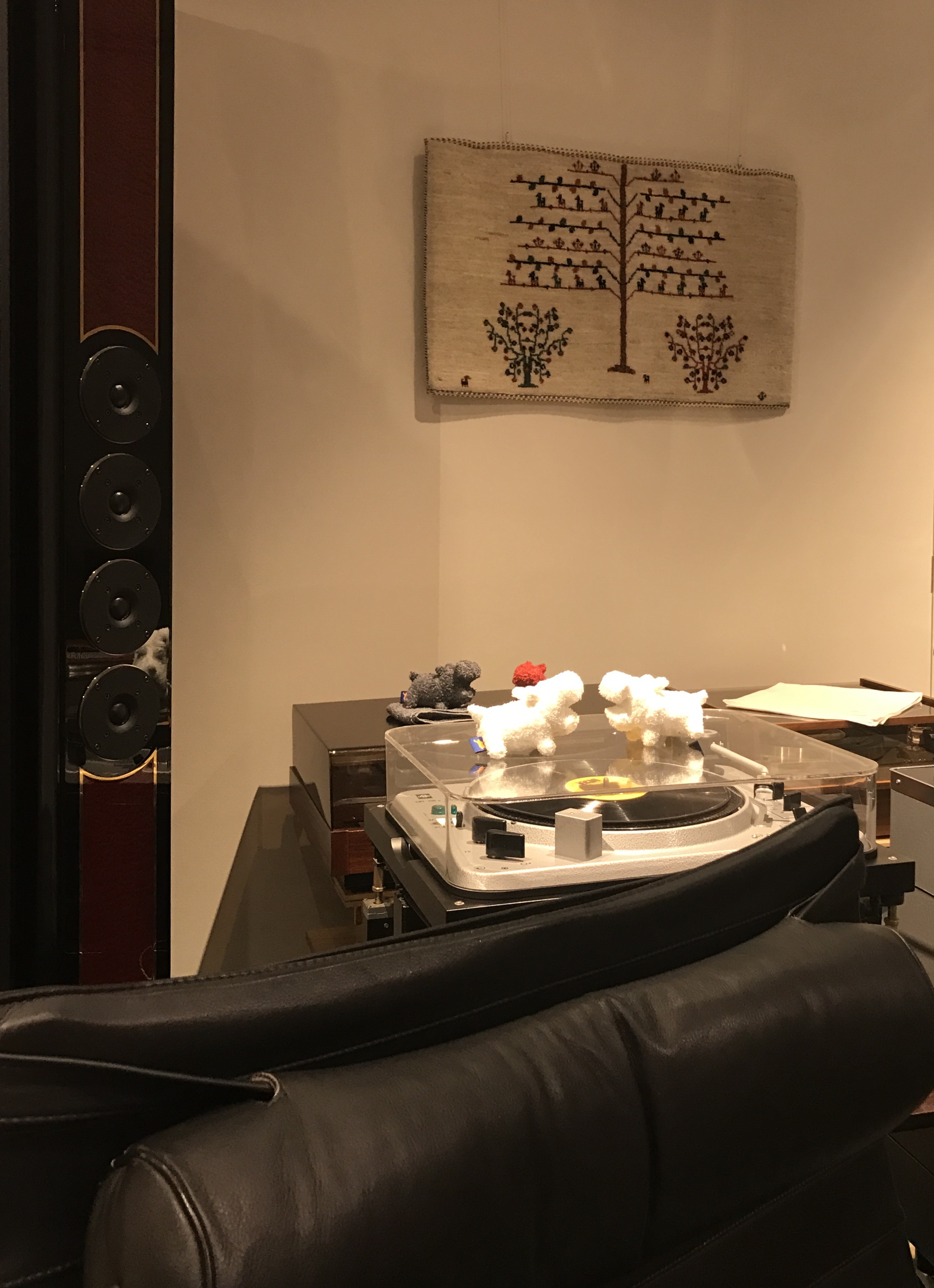 LINN KLIMAX EXAKT350を鳴らすにしろ、Tannoy Autographを鳴らすにしろ、Brodmann JB205の側面と横の壁、スピーカー正面の壁、ターンテーブルの上のアクリルカバー、梁などに囲まれて音がたまりやすいのですが、ここに一番上の写真のように小さいカバを置くと、あら不思議!