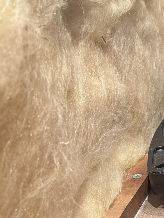 それでChatsworthの中に元々付いていた古い吸音材(下の写真)がどうもザラザラ/イガイガした音の原因らしいことがわかり、いつも調整で使っているホワイトキューオン(上の写真)に変えたところ、かなり良くなりました。