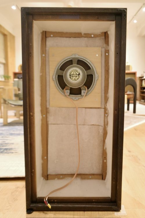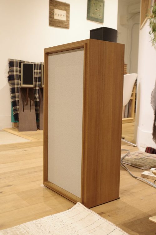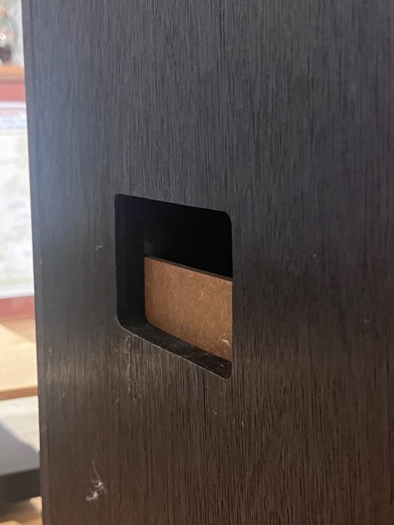 他のスタッフにも聴いてもらったところ、Chatsworthのキャビネットは奥行きが浅くて容積的にもう少し欲しい感じなので、背面のバスレフ穴をもう少し広く開けたほうが良いのでは?という意見をもらい、写真のように塞いでいた穴を少し広めに開けたところ、音が前に来ました。