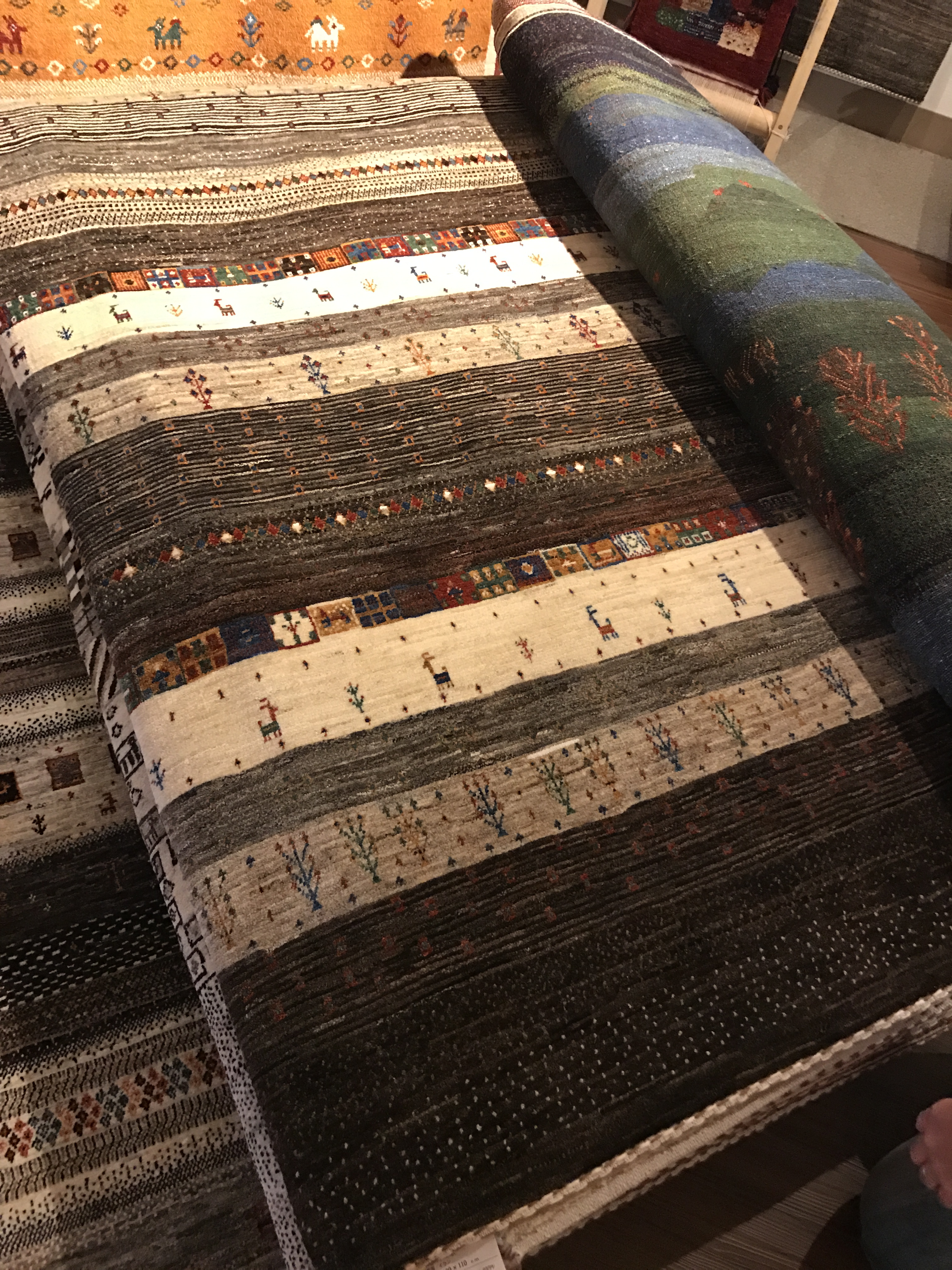 大量に届いたギャッベを積み上げながら、あれもいいな、これもいいなと。
