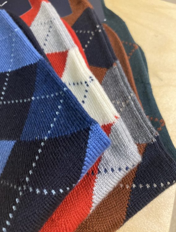 おしゃれは足元からと言うけれど、さりげなく見える靴下の柄や質感。足元にビビットカラーを選ばれているなどコーディネートのアクセントアイテムですね。