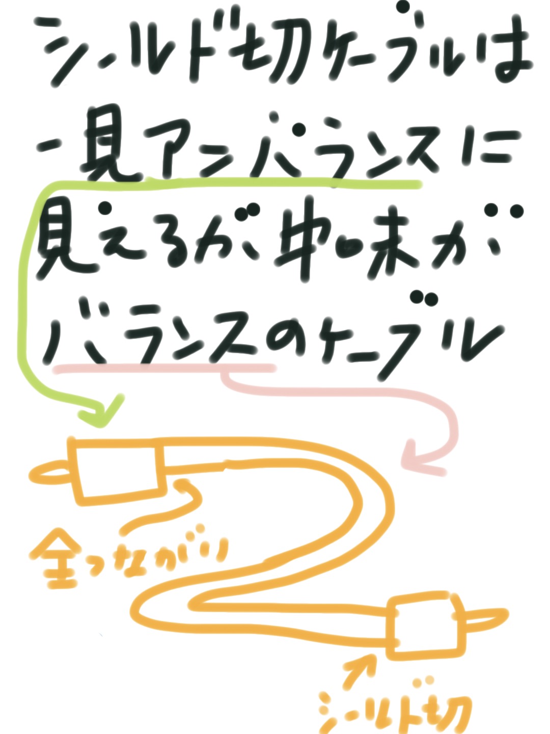 ※シールド切りケーブルは、RCA端子ですが線自体はバランスケーブルで、片側はシールドが切れていて、片側はシールドもホットもコールドも全部繋がっているというもの。