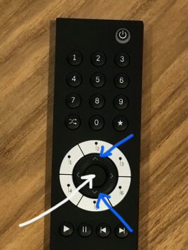 中央の丸いダイヤルは、プレーヤーのダイヤルと同じ動きが可能。上向の矢印(写真青矢印)を一度押すと、本体のインジケーターにメニュー画面が表示されます。