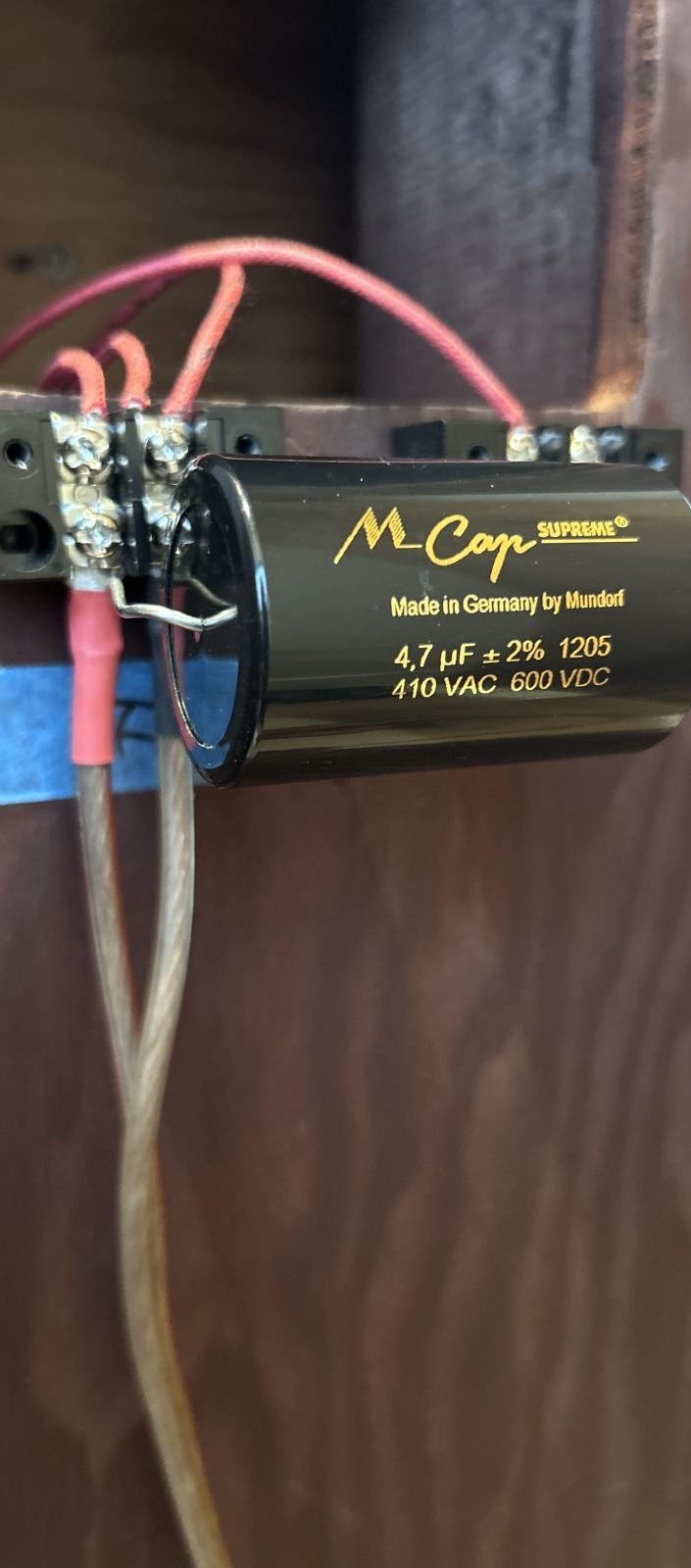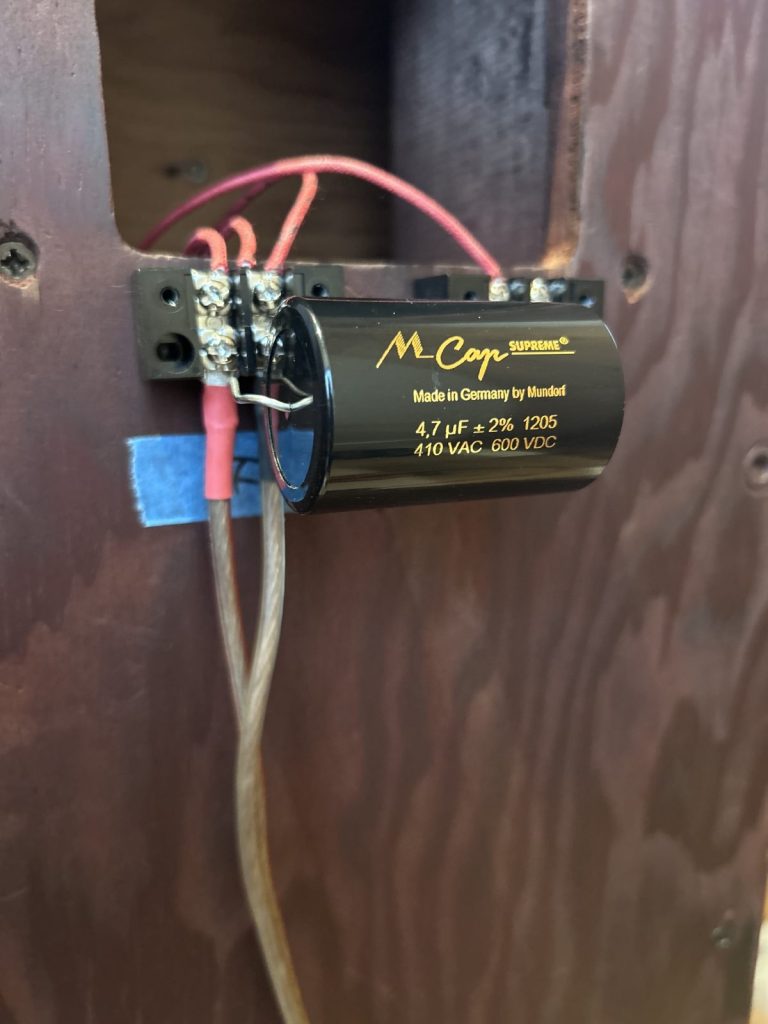 075とD130をフィルムコンデンサーローカットのみで接続。また、コンデンサも色々試し今のところはMundolf Mcap Supremeの4.7μが品があって現代的、、ということでこれで鳴らしています。もちろん元々の鳴らし方に戻すこともできますが、ねじ止めしているだけなので色々遊べる。