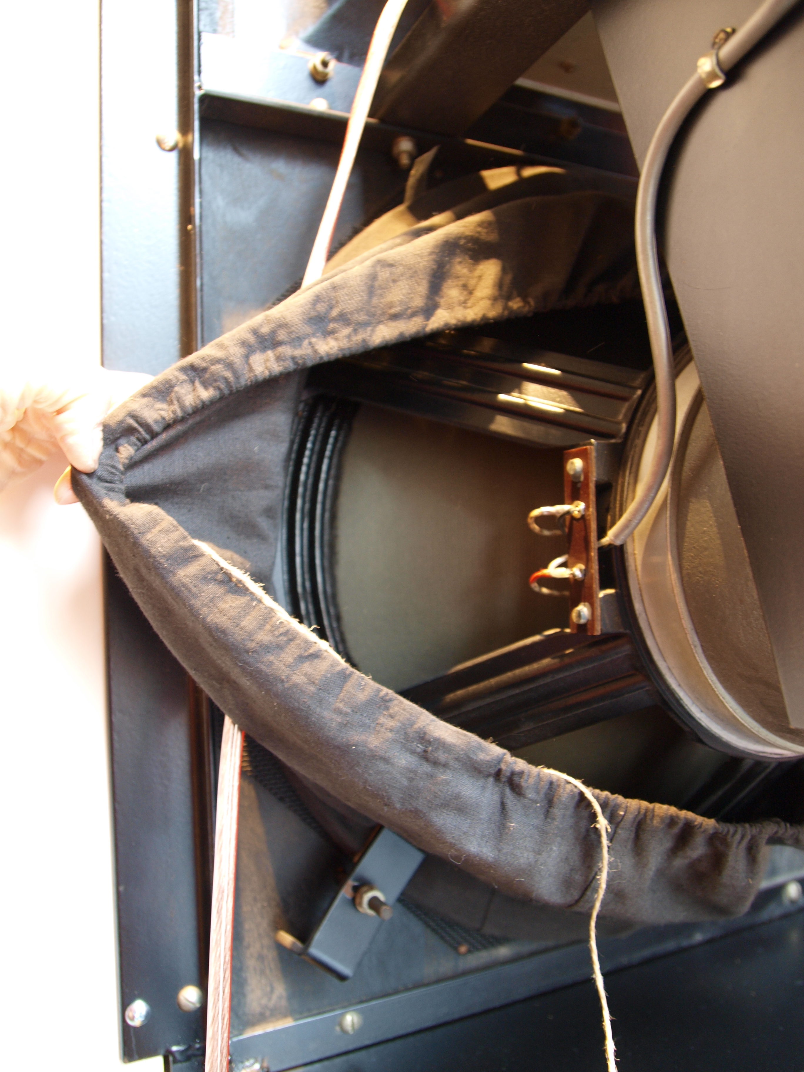 ウーファーは普段は埃よけの布製カバーで保護されています。これはユニットにセンターキャップが付けられていないので、ボイスコイルに埃が入らないようにするため・・とのこと。