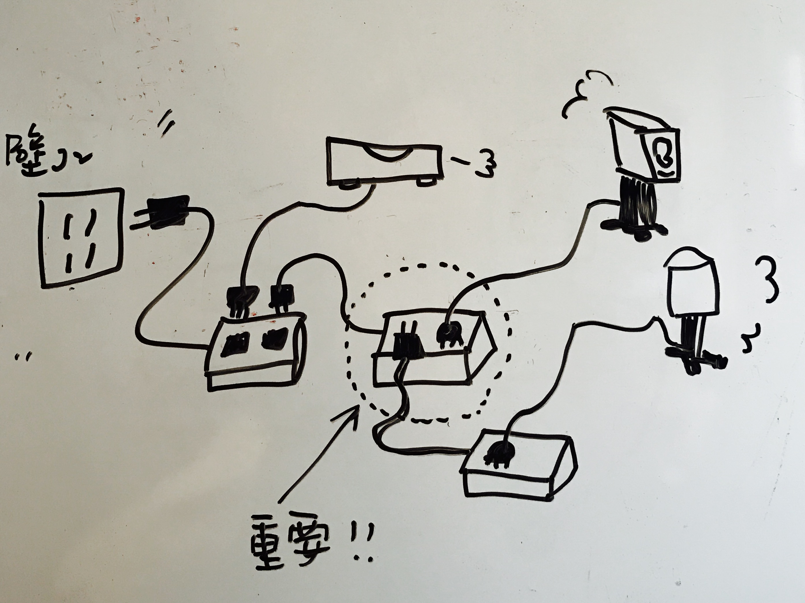 まず、1つ目のタップから2つ目のタップをとりましたら、2つ目のタップのあたまのほうから、先に3つ目のタップの電源をとります。