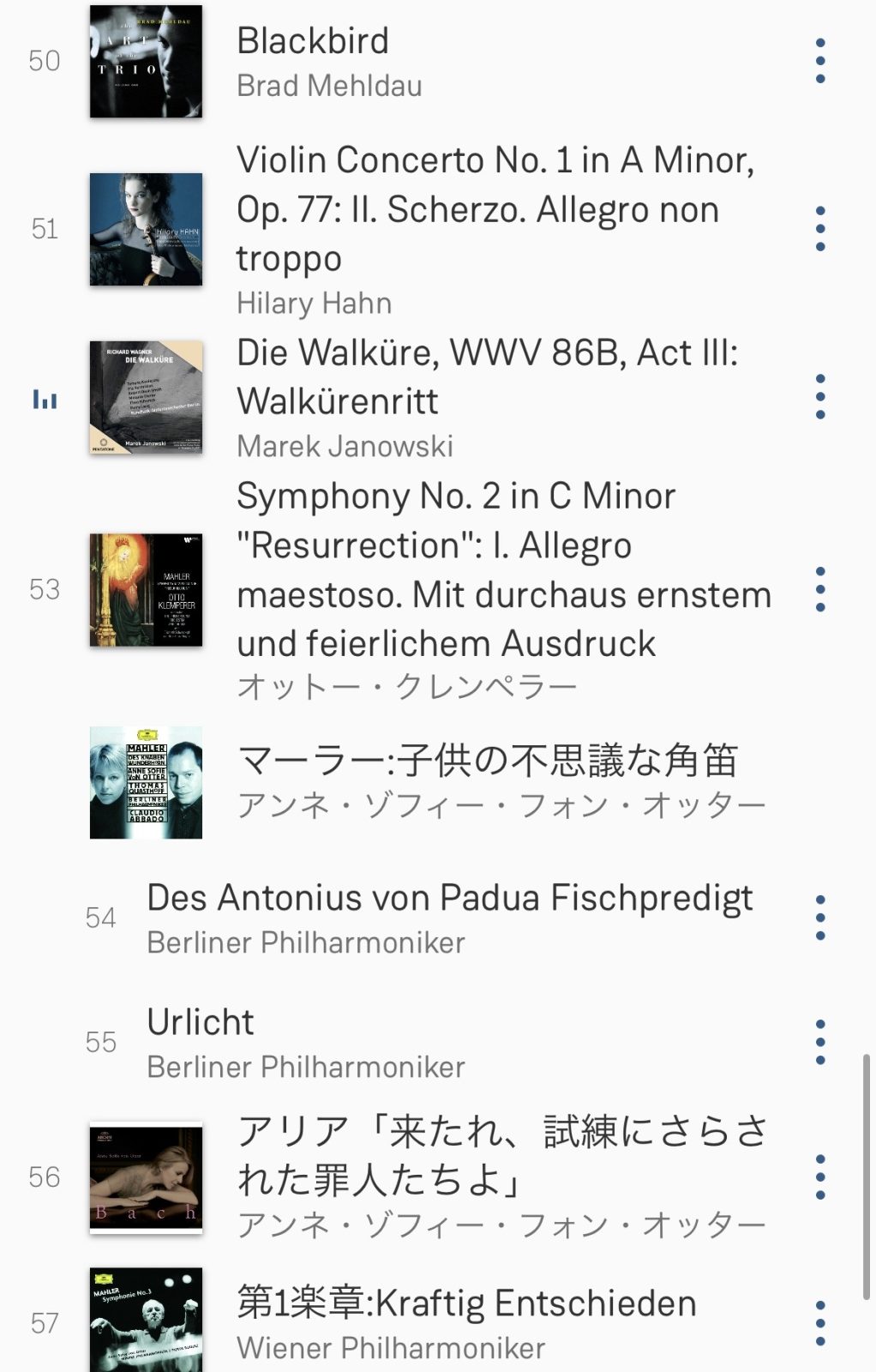 マーラー、交響曲2番の1楽章、ワーグナー「ワルキューレの騎行」などはもちろんいいですが、ヒラリー・ハーンの若い時のキリリとしたヴァイオリン協奏曲はまた特に良い。