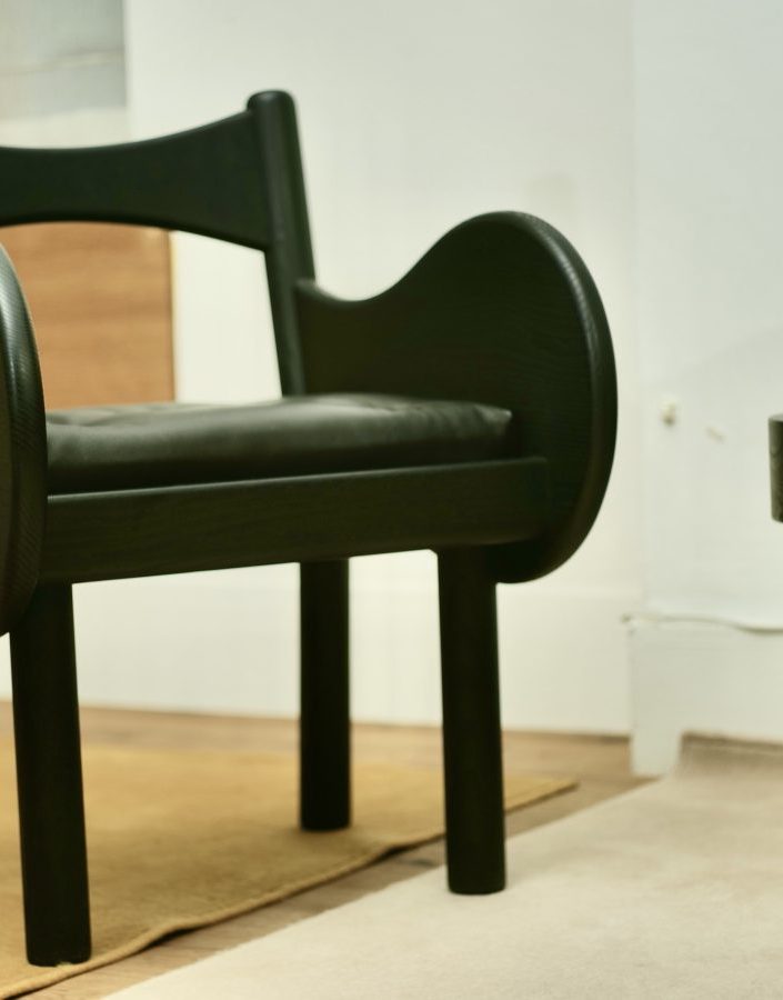 アームのくびれが印象的なGourd armchair. Black ver. ぷっくりした顔ながら収まりの良い腰掛け。背中のあずけ具合も絶妙です。